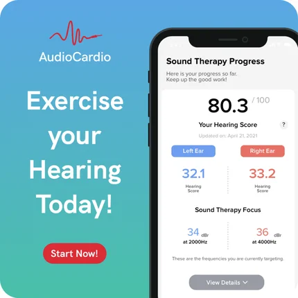 AudioCardio is a mobile app that assesses your hearing and generates a personalized sound therapy (inaudible) designed to maintain and strengthen your hearing. It is a once a day, one hour sound therapy that stimulates the cells inside your ear. You can think of it as physical therapy for your hearing. The sound therapy is delivered using headphones or earbuds, is completely passive and runs in the background while you do other activities like listening to music, checking email and falling asleep.